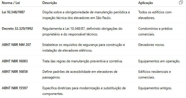 O principal conjunto de regras vem da Prefeitura de São Paulo, por meio da Lei nº 10.348/1987 e do Decreto nº 32.329/1992, que estabelecem diretrizes obrigatórias para instalação, manutenção e inspeção de elevadores em edificações públicas e privadas.